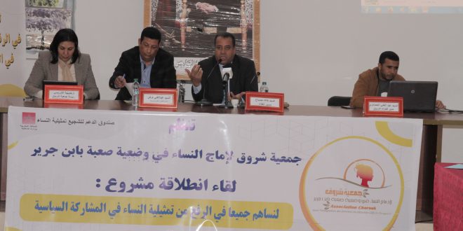 عرف مركز شروق للمرأة في وضعية صعبة ، زوال اليوم الجمعة 25/02/2022 ابتداء من الساعة الثالثة زوالا، تنظيم اللقاء الافتتاحي لمشروع: لنساهم جميعا في الرفع من تمثيلية النساء في المشاركة السياسية، من طرف جمعية شروق، بشراكة مع وزارة الداخلية، ويندرج هذا المشروع في اطار صندوق الدعم لتشجيع تمثيلية النساء السياسية، وذلك لدعم جهود المغرب من أجل جعل المرأة المغربية في قلب التنمية وفي قلب البناء الديمقراطي .