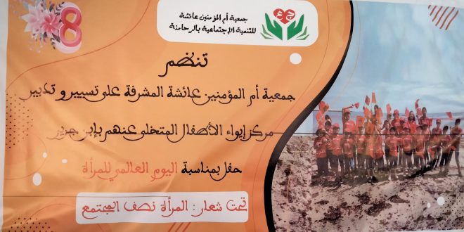 تحت شعار “المرأة نصف المجتمع” احتفى مركز أم المؤمنين عائشة للأطفال المتخلى عنهم المسير من طرف جمعية عائشة للتنمية الاجتماعية بابن جرير، بنساء المركز والعاملين به وذلك في اطار الاحتفال باليوم العالمي للمرأة ، الحفل تميز بفقراته الغنية والمتنوعة والتي كانت من تنشيط اطفال المركز الذين ابانوا عن حس تنظيمي عالي ، يدل على الاهتمام والرعاية التي يحظون بها داخل المركز والتي لا تقتصر فقط على النوم والتغذية وانما تتعداهما لتشمل التربية على المواطنة وكدا تنمية حسهم الفني والثقافي من خلال تنظيم انشطة غنية ومتنوعة طيلة السنة داخل المركز، كما تأتي هذه الالتفاتة من طرف جمعية ام المؤمنين لإعطاء النساء العاملات بالمركز –مركز ام المؤمنين عائشة للأطفال المتخلى عنهم- نظير ما يقدمونه من خدمات جليلة للمستفيدين بالمركز .