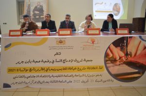 زوال امس السبت 21 رمضان 1443 هجرية الموافق ل 23 ابريل 2022 ميلادية بفضاء شروق المتعدد الوظائف للنساء بالرحامنة،اعطاء انطلاقة مشروع الخياطة والفصالة بشراكة مع وزارة السياحة والصناعة التقليدية والاقتصاد الاجتماعي والتضامن ،وذلك بحضور كل من: ممثلي الوزارة الشريك الرئيسي في هذا المشروع، المدير الاقليمي للتعاون الوطني بالرحامنة ،المدير الاقليمي للصناعة التقليدية ورئيسة جمعية شروق لادماج النساء في وضعية صعبة بابن جرير الأستاذة خديجة الادريسي وعدد من مسؤولي الجمعية والطاقم الاداري لها،وعدد من رئيسات مجموعة من التعاونيات النسائية وفعاليات المجتمع المدني والمستفيدات من هذا المشروع .