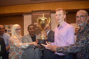 و بعد أسبوع من المنافسة في مسابقتين، مسابقة الاساتذة الكبار الدوليين المشاركين في الدوري و المسابقة المفتوحة لاقل من 2200في التصنيف ، فاز بالمسابقة الاساتذة الكبار الدوليين للشطرنج التي دارت اطوارها بفندق فرح و ضمت 74 لاعبة و لاعب قدموا من مختلف دول المعمور “Pultinevicius Paulius” من لتوانيا ، فيما فاز الفلسطيني محمد الدمج بالدوري المفتوح لأقل من 2023 في التصنيف و التي عرفت مشاركة 550 لاعبة و لاعب بقاعة محمد مجيد للرياضات بأنفا